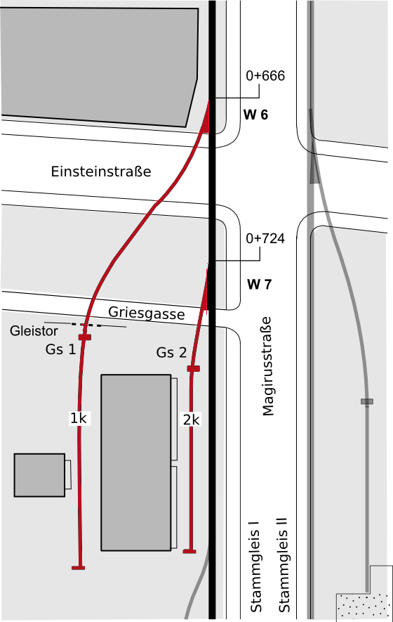 Ein letztes Teilstück des Stammgleises bis zur Blaubrücke war bis 2024 in Betrieb, soll aber zusammen mit dem Nebenanschlußgleis durch das Gelände der FUG zur Anlieferungvon Straßenbahnen bei der SWU weiterhin erhalten bleiben.
